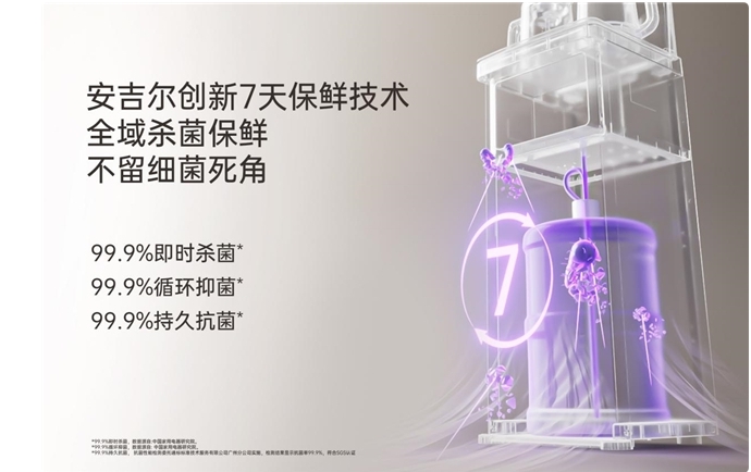 安吉尔7天保鲜科技,杀菌99.9%+抑菌99.9%+抗菌99.9%,全链路守护水质新鲜