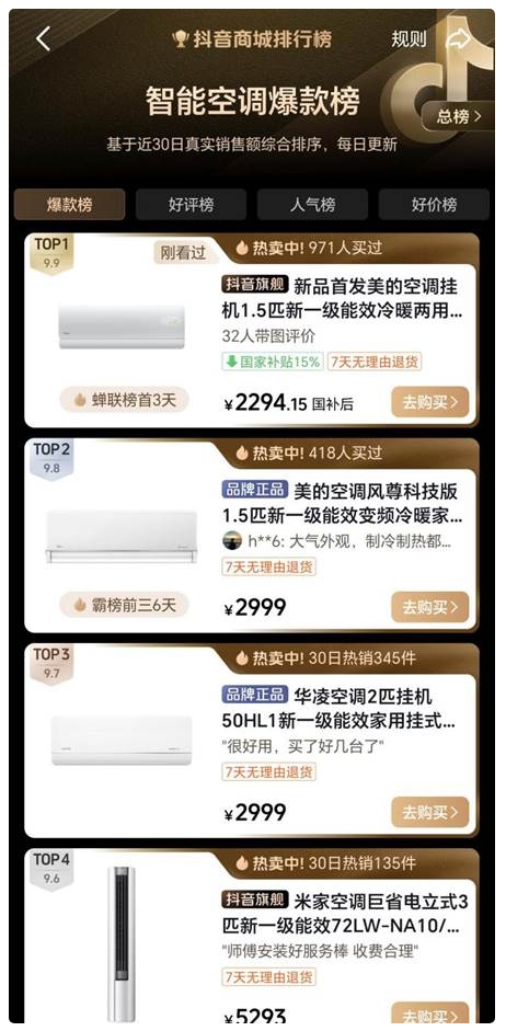 2026刚开年,空调行业首款爆品已然出现——全新上市美的酷省电二代便凭硬核实力脱颖而出,强势斩获抖音商城智能空调爆款榜、人气榜、好价榜三榜Top1,以销量、关注度、性价比的全维度碾压之势,成为智能空调赛道的现象级爆款。