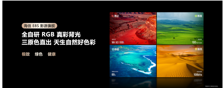 色彩表现上,海信E8S搭载全自研RGB真彩背光,每颗灯珠集成R/G/B三色独立发光芯片,无需任何中间转换环节直接发光,光谱纯净无杂光,轻松实现100% BT.2020超广色域,色彩还原度较单色背光量子点Mini LED产品提升20%以上,彻底解决量子点Mini LED 色彩纯度不足、高亮泛白的短板,无论是电影暗部色彩层次,还是照片真实质感,都能精准还原。