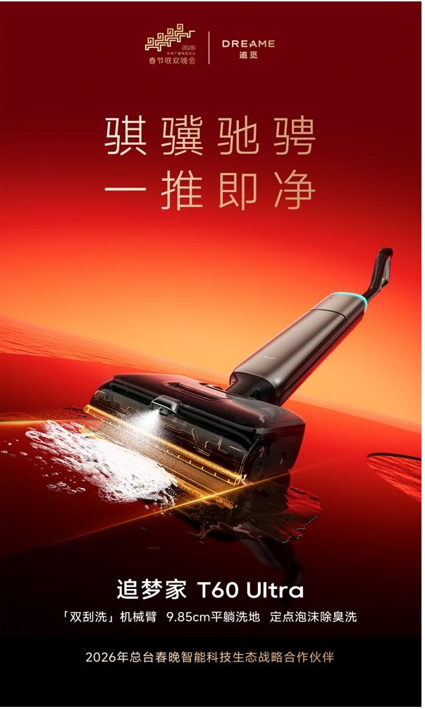 作为国家级文化盛会,央视春晚不仅是时代精神与主流价值的重要表达场域,也是国民品牌集中亮相的重要窗口。与央视春晚的战略合作,意味追觅科技在创新实力、产品竞争力与社会责任等方面,已获得全球广泛认同。其中,洗地机作为追觅科技的核心业务,在高端清洁科技领域的创新成果与产品实践,已服务全球超3000万家庭。