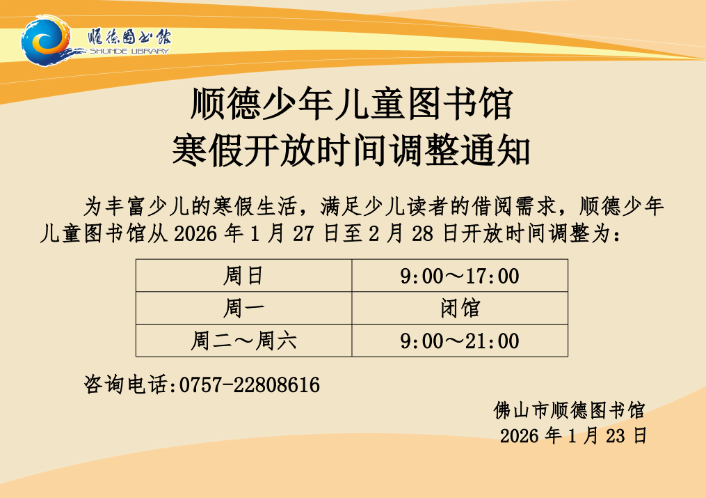 >顺德少年儿童图书馆寒假开放时间调整通知