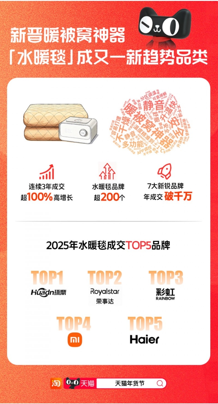 水暖毯在天猫取得了持续三年成交超100%的高增长,是家电品牌争相布局的趋势新品类。截至2025年底,有超200个品牌在天猫推出水暖毯产品,目前,环鼎、荣事达、彩虹、米家、海尔成为天猫成交TOP5品牌,米小舒、Q果等7个入驻天猫不到3年内的新品牌,在天猫实现单品类年销售额破千万;罗莱、水星等家纺品牌跨界布局水暖毯,拉动品类整体客单价提升31%。