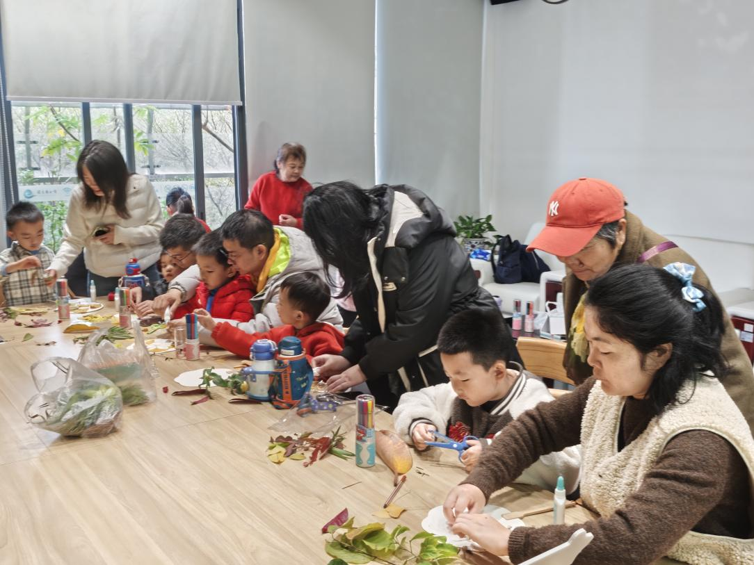 在亲子手工制作环节,家长和孩子们一起动手在扇子上创作树叶拼贴画,将一片片形状各异、色彩斑斓的叶子变成了独一无二的精美扇子。