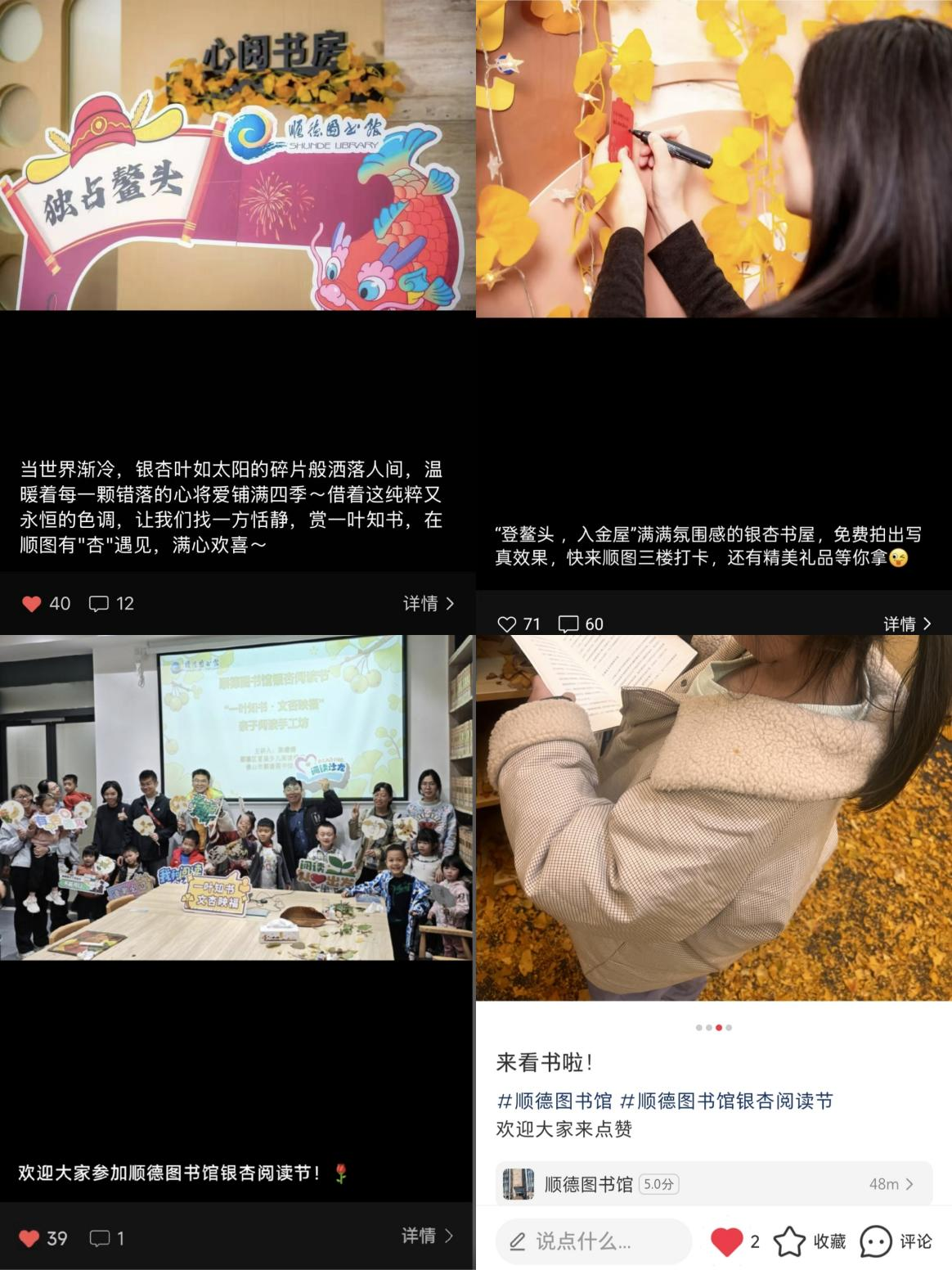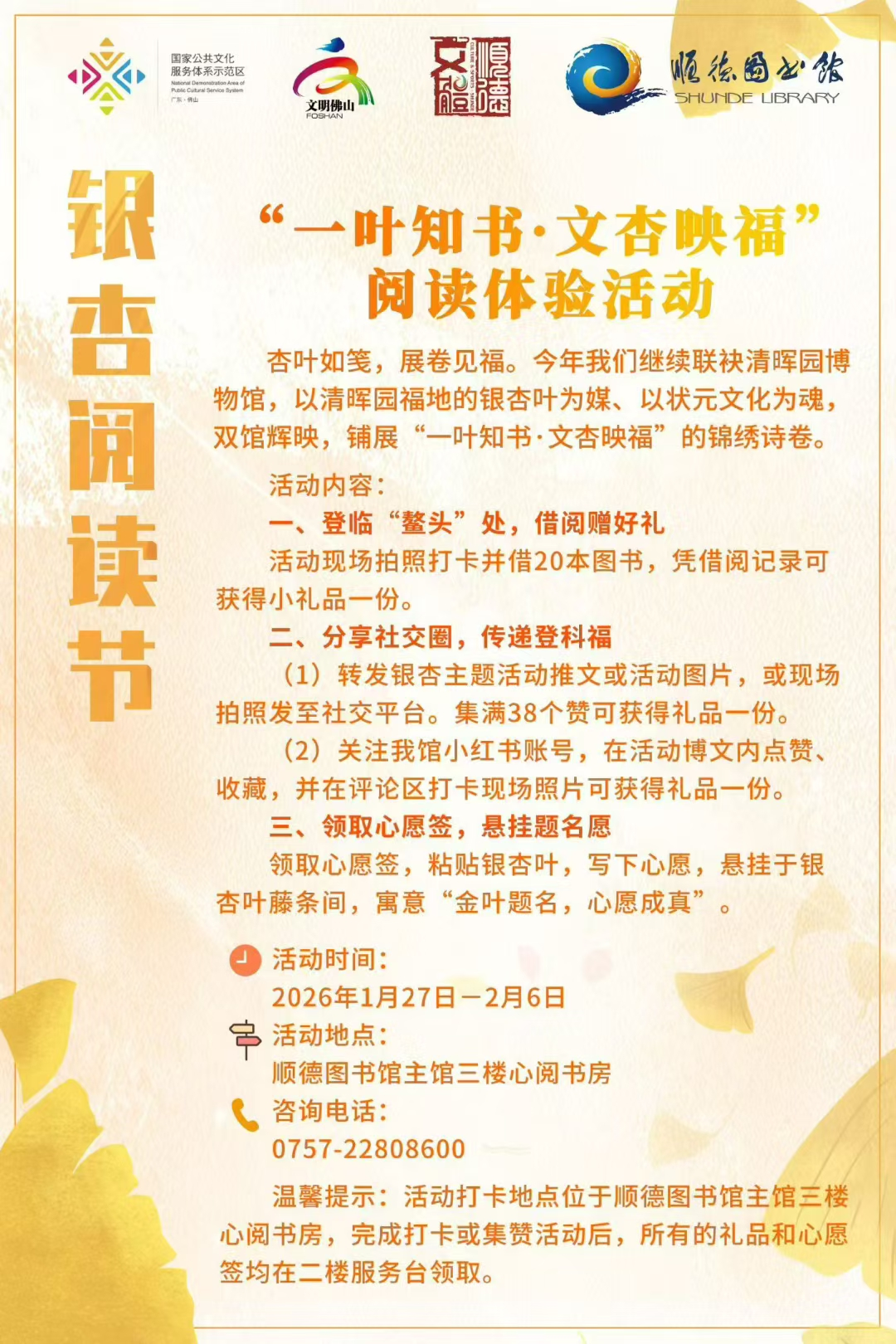 即日起至2月6日,顺德图书馆继续联袂清晖园博物馆,以清晖园福地的银杏叶为媒、以状元文化为魂,双馆辉映,推出“一叶知书·文杏映福”顺图银杏阅读节,旨在营造一个集银杏打卡、静心阅读、文化祝愿于一体的沉浸式阅读体验空间。