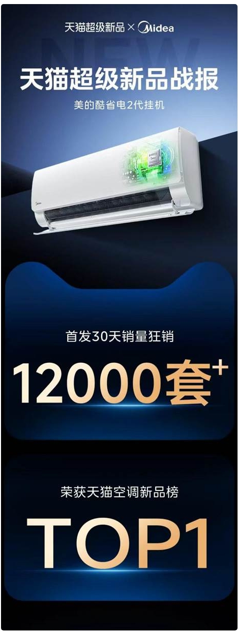 2026开年,美的酷省电二代空调便迎来火爆开局,天猫开售仅30天,销量即突破12000套,强势斩获天猫空调新品榜冠军宝座。
