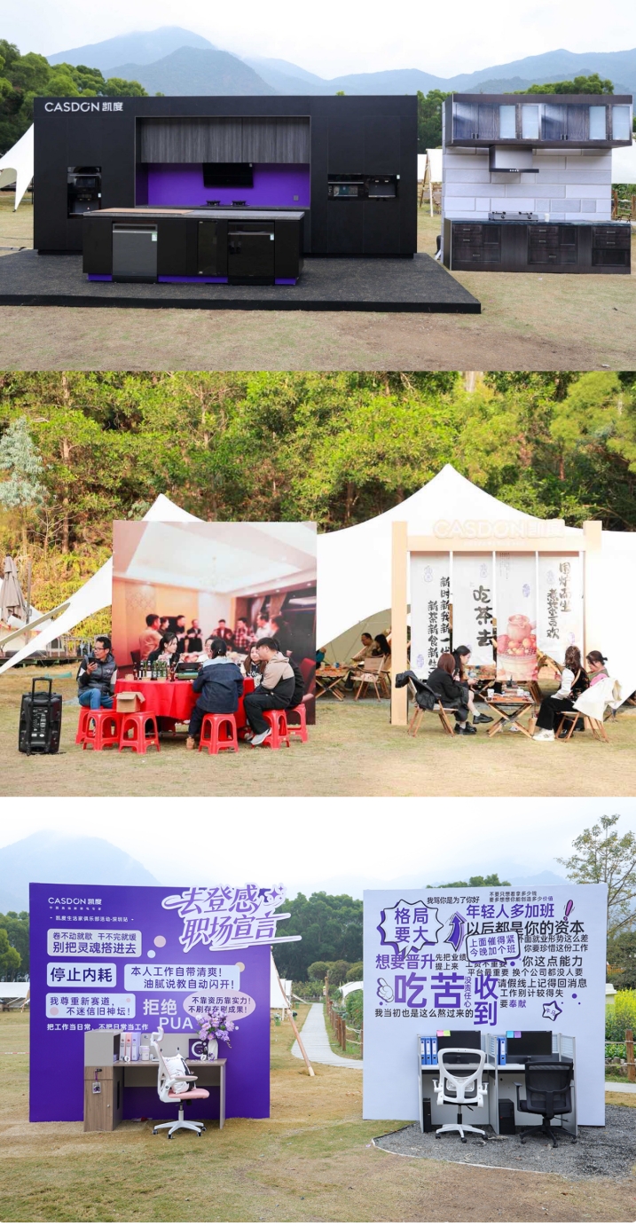 凯度没有回避这种社会情绪,反而用 “反登感・平行时空馆”,将 “老登感” 与 “松弛感” 的冲突摆到了台面上。走进平行时空馆,三个平行宇宙的对比直击人心:一边是老厨房的手忙脚乱,油污沾满灶台,做饭像一场 “战斗”;另一边是凯度 “幂” 式生活美学馆,智能厨电解放双手,清新的空间让烹饪变成享受。一边是写满 “我骂你是为了你好” 的窒息格子间,压抑得让人喘不过气;另一边是贴着 “停止内耗” 的杨幂式元气办公桌,处处透着 “靠实力说话” 的底气。一边是喧闹强迫的传统酒桌,劝酒声此起彼伏;另一边是围炉煮茶的小天地,安静自在,不用勉强自己迎合他人。这种强烈的视觉反差,让每个参与者都能在其中看到自己的影子 —— 原来我们抵触的不是 “传统”,而是传统里那些束缚人的 “老规矩”;我们渴望的不是 “颠覆”,而是像凯度新厨电那样,用创新打破不便,找回生活的自主感。