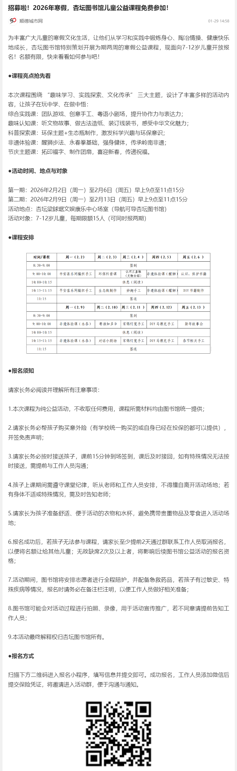 为丰富广大儿童的寒假文化生活,让学生们从学习和实践中锻炼身心、陶冶情操、健康快乐地成长,杏坛图书馆特别策划开展为期两周的寒假公益课程。