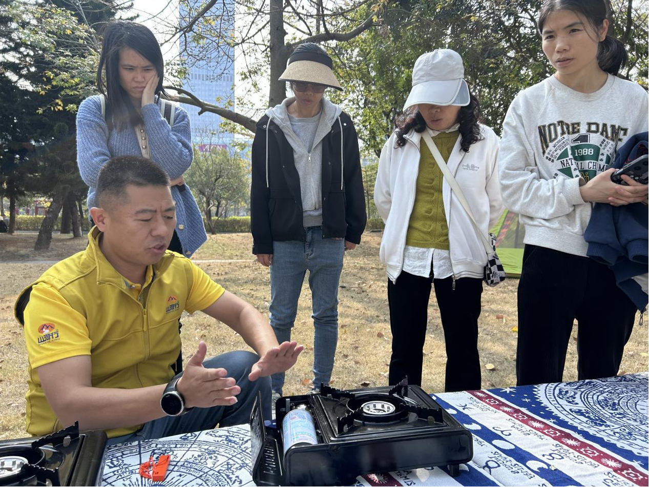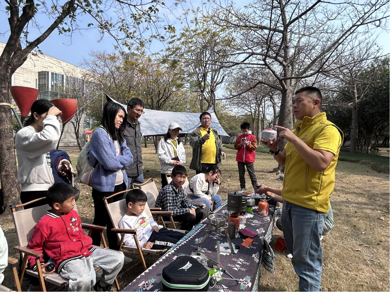 随后,参与家庭移至户外草坪进行沉浸式的实操学习。讲师结合理论知识现场演示户外炉具组装、点火、控火与安全熄灭的完整步骤,强调用火时的安全距离、防风与灭火准备,并指导家长与孩子共同操作,确保知识转化为实际技能。