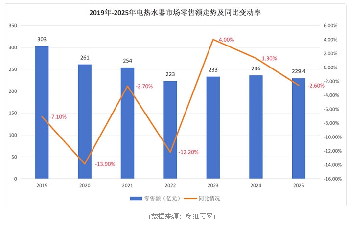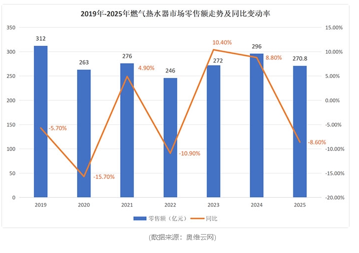 2023至2025年,热水器市场经历了一段从复苏到回调的起伏过程。2023 年行业迎来复苏,电热水器、燃气热水器零售额同比分别增长 4.0%、10.4%;2024年,在政策推动的以旧换新活动带动下,两大品类延续增长态势,零售额同比分别上涨1.3%、8.8%。然而进入2025年,受宏观经济环境与房地产市场调整的双重影响,行业再次承压,市场整体规模出现回调。