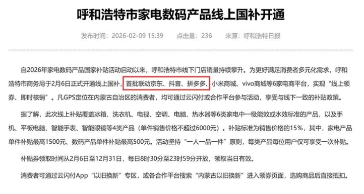 2月6日,内蒙古呼和浩特市首批线上国补平台名单公布,京东、抖音、拼多多等6家平台在列;