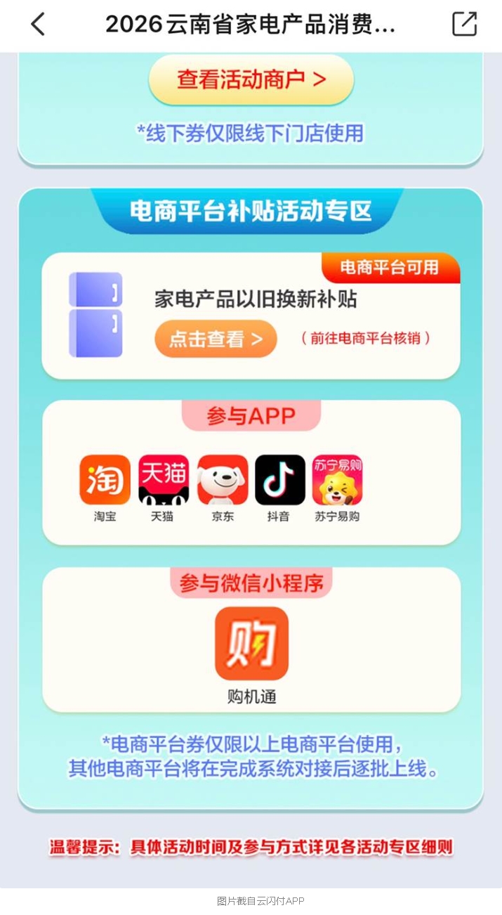 以云南为例,家电以旧换新除了线下门店专区、线下农村地区,还有电商平台补贴活动专区,目前参与的APP包括淘宝、天猫、京东、抖音、苏宁易购,参与的微信小程序是购机通,其他电商平台则将在完成系统对接后逐批上线。