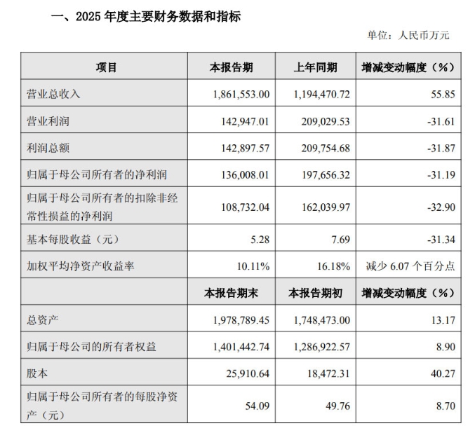 数据显示,公司全年实现营业总收入186.16亿元,同比大幅增长55.85%,展现出强劲的营收增长势头;但与之形成鲜明对比的是,归母净利润仅为13.60亿元,同比下滑31.19%,扣非净利润10.87亿元,降幅进一步扩大至32.90%,利润端的承压态势显著。