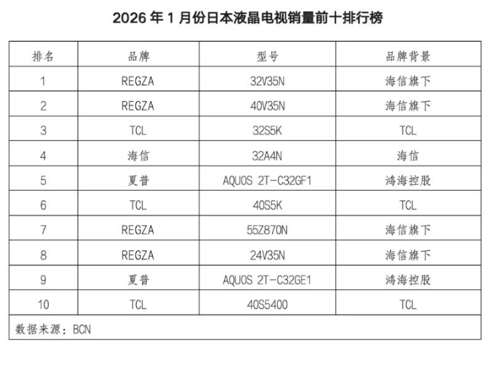 从1月份数据看,日本电视市场呈现出三大特征:大屏电视成为结构性引擎;4K受捧,OLED持续走低;中国品牌线下渠道占绝对优势,行业普遍预计,未来几年中国品牌累计份额可能达到60%—70%。其中,海信(含旗下REGZA)表现强势,TCL紧随其后。