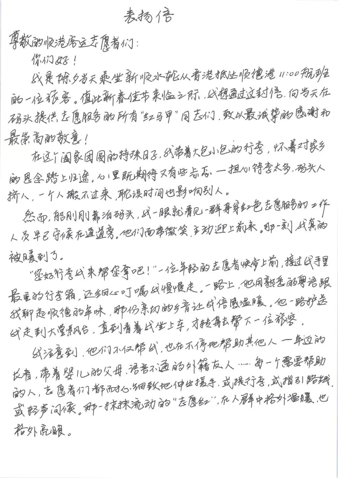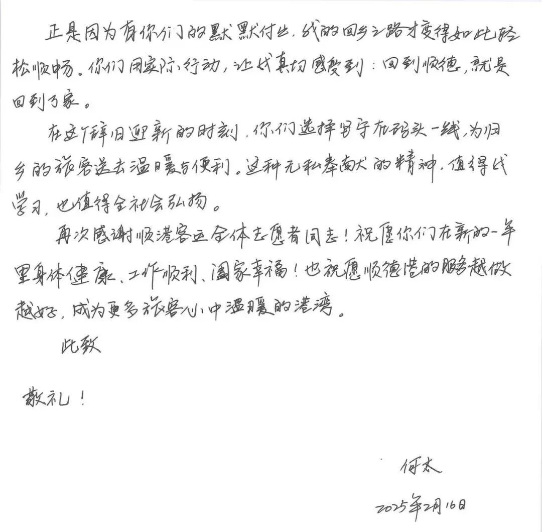 除夕万家团圆之时,顺德港依旧船来船往。旅客何太在信中,特意致谢坚守岗位的“红马甲”志愿者——他们正是顺德文旅集团下属顺控资管公司的一线员工。