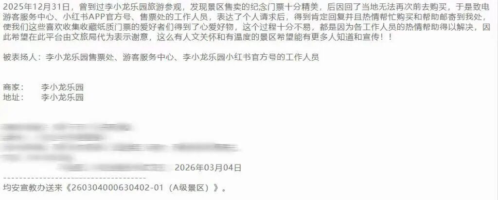 第二份“礼物”,来自佛山市12345政务服务便民热线——这不是投诉,而是一通专程送来的表扬与感谢。2025年12月底,一位门票收藏爱好者来到李小龙乐园,被景区精美的纪念门票深深吸引。