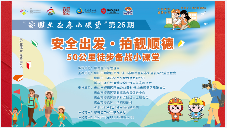 春日序曲,步履不停——2026年顺德50公里徒步即将如约而至。为了让每一位参与者都能安全、尽兴地完成这场城市漫游,我们在徒步前一周特别推出户外徒步安全与摄影教学课堂,从安全防护到影像记录,为你全程护航、添彩赋能,让这段春日旅程留下更多美好回忆。