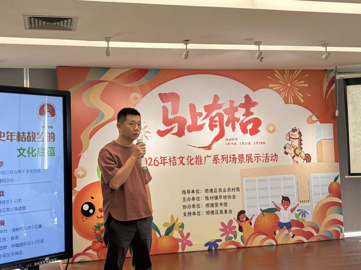 启动仪式上,顺德区农业农村局党组书记谭逢显、顺德区乡村振兴局常务副局长郭国防、农业发展股股长马少灵、顺德图书馆馆长蔺梦华、顺德区慈善事业联合会资源部部长陈阳、陈村镇年桔协会副会长梁钜东等领导嘉宾莅临现场。活动伊始,一段精心制作的年桔文化宣传视频缓缓播放,梁钜东副会长随后登台,分享年桔百年种植技艺、家族传承故事与“桔”即“吉”的文化寓意,立体呈现岭南年桔的深厚底蕴。随着领导嘉宾共同启动活动,这场以桔传吉、以香聚福的马年文化之旅正式拉开帷幕。