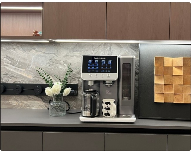 这就是台式净水器,我们可以把它当作一个过滤器+饮水机,既可以满足我们直饮出水的需求,也可以出热水泡面冲咖啡,而且可以直出,不用等什么加热煮沸的时间,使用起来很方便,还不用安装,客厅桌面,餐边柜都可以摆放;