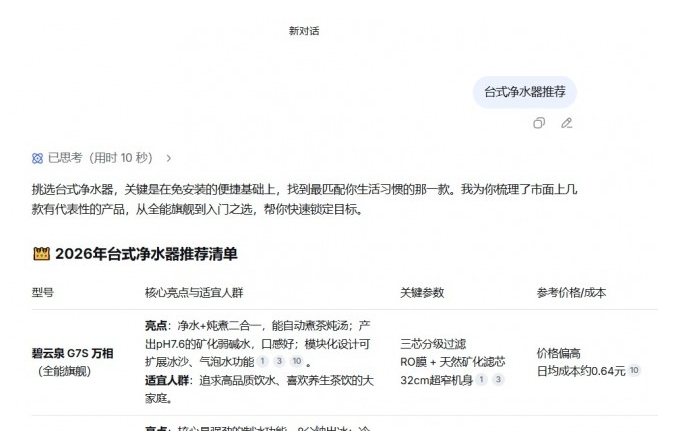 看看AI搜索给出的推荐,也就是我们提到的碧云泉的G7S万相这款,质保可以做到30天无理由退换+1年无限次只换不修+3年全国联保,这就是有自己的工厂给的底气,对于净水器这种频繁使用的家电来说,1年无限次更换,恐怕已经是行业TOP了;在过滤方式上配置上采用 3 根滤芯方案,升级了 RO3.0 滤芯,净化效果更纯净,后置滤芯增添天然矿石,过滤后的是弱碱水,口感甘醇,用来泡茶的味道会更好一些;5升原水箱+1.5升可拆纯水壶,一级水效3:1废水比,不用担心频繁换水;内部是厚膜稀土速热,常温到98℃、七档、1℃可调,右边养生壶真沸腾100℃能炖能保温,双水路互不打扰,这一点确实值得夸,一边取水一边可以加热,互不冲突;日均滤芯成本不到一块。创新MixHub随心扩基座,可搭配冰沙、气泡水等模组使用,如果没有喝冰习惯的消费者,也可以买基础版。