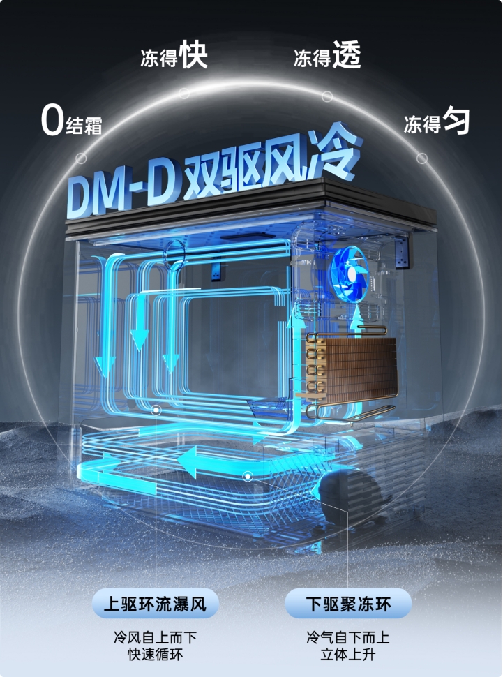 为了真正破解家庭存茶难题,美的无霜王冷柜创新搭载DM-D 双驱风冷科技,上驱采用环流瀑风设计,自上而下驱动冷风在柜内快速循环,形成环抱式送风,实现全域均匀制冷,从根源上做到不结霜、干爽不吸潮,杜绝茶叶受潮结块、香气散失的问题;下驱搭载聚冻环技术,自下而上驱动冷气立体上升,精准包裹底部存放的茶叶,实现无死角快速制冷。在DM-D双驱风冷科技加持下,这款冷柜既规避了直冷冷柜易结霜、损伤茶叶的弊端,又解决了传统风冷易出现风口堵塞、制冷不均衡、保鲜力不足的行业痛点,为春茶提供长效稳定的保鲜守护,让鲜醇滋味得以长久留存。