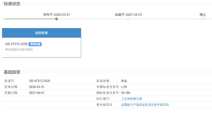我国首部《移动电源安全技术规范》强制性国家标准(GB 47372-2026)已于 3 月 31 日正式发布,将于 2027 年 4 月 1 日起正式实施,为移动电源行业安全划定“硬红线”。