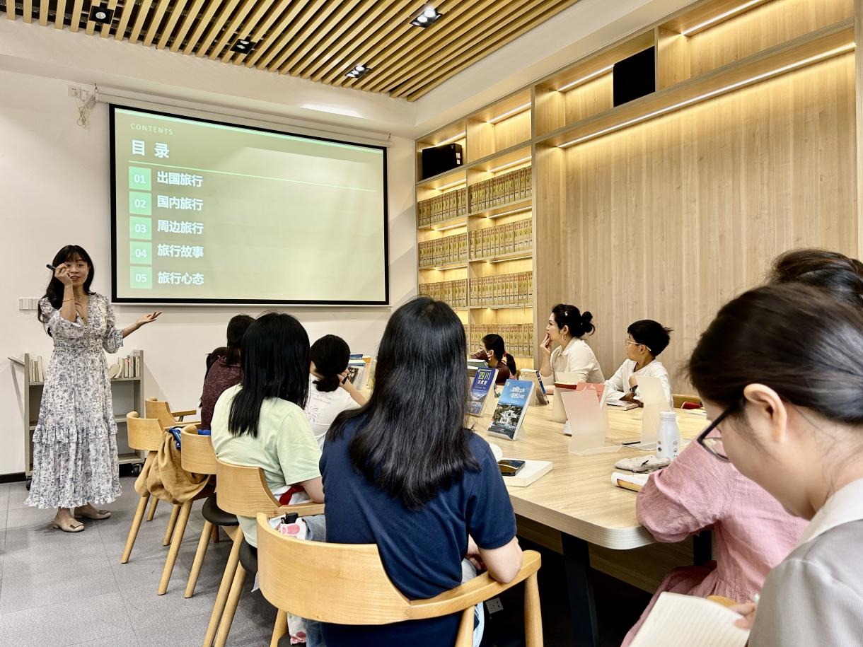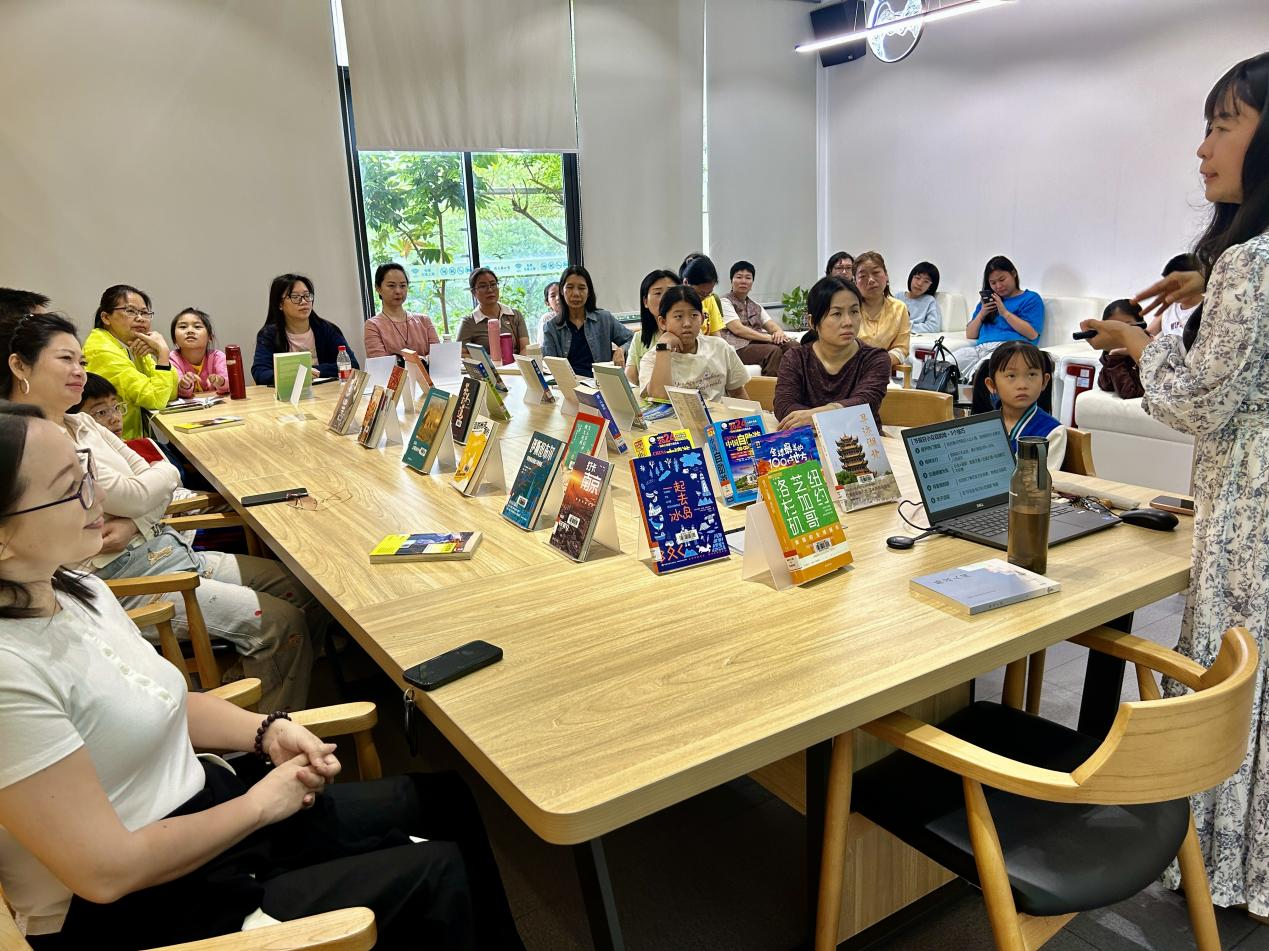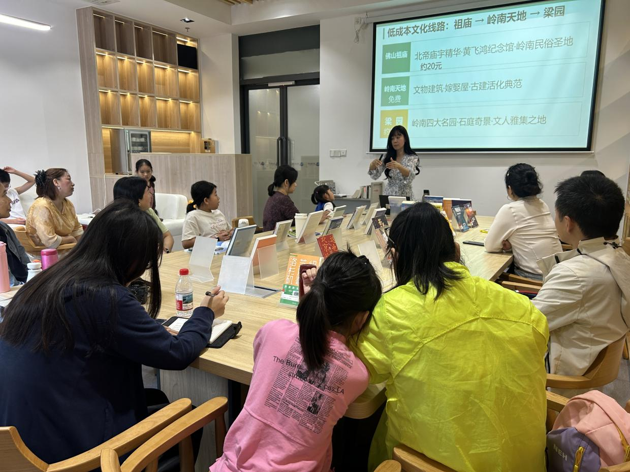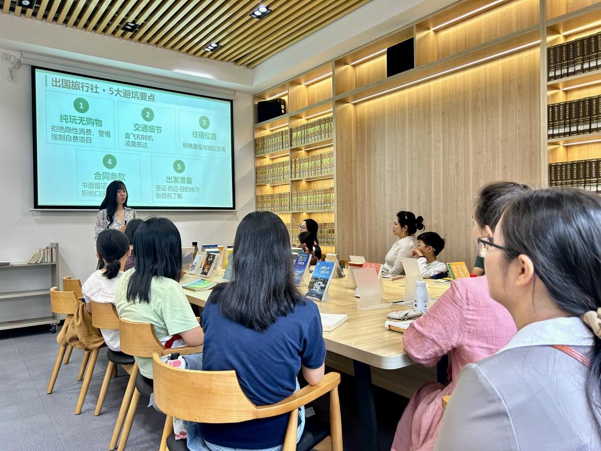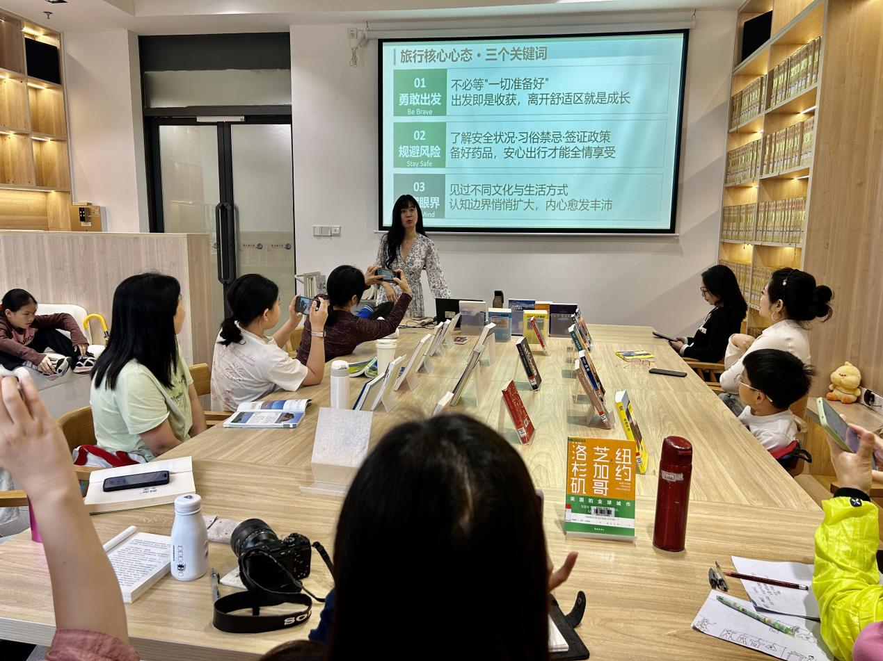 现场的家长与孩子们听得专注投入,时而认真记录,时而互动交流。桌上陈列的旅行主题书籍,与分享内容相得益彰,营造出浓厚的阅读与分享氛围。
