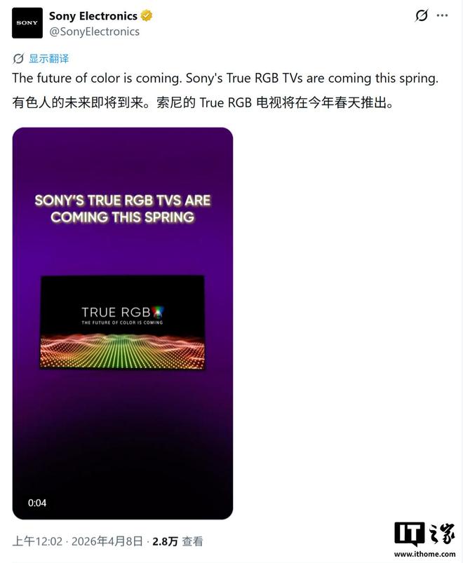 索尼在推文表示将会在 2026 年春季推出 True RGB Bravia 电视,并且会在近期公布更多产品细节。