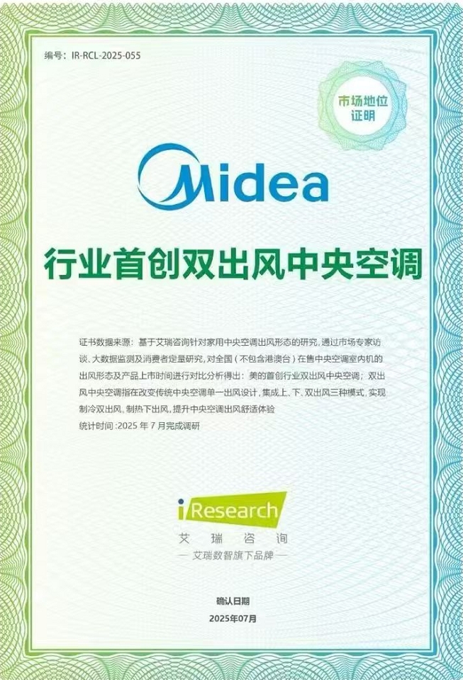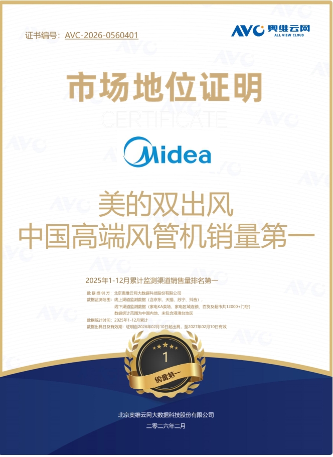 此前,美的双出风风管机已率先赢得市场认可,斩获中国高端风管机销量第一的成绩。从行业首创到市场跑通,美的双出风风管机已经完成了从技术验证到消费验证的跨越。奥维云网市场地位证明显示,2025年1-12月,美的双出风位列中国高端风管机销量第一;与此同时,美的也登顶中国中央空调市场监测销量第一。