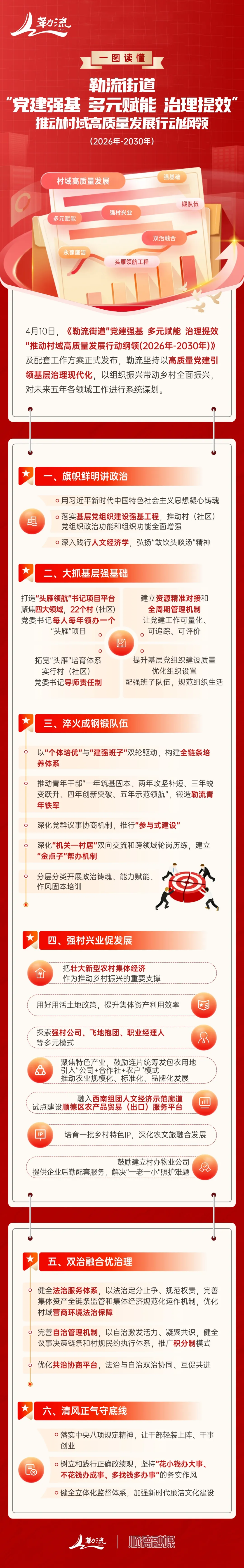 从“头雁领航”到“新锐淬火”,从“强村兴业”到“法治固本”,勒流街道以“1+5+N”政策体系为四梁八柱,打出了一套环环相扣、协同发力的组合拳。未来五年,勒流将以党建为引领,以经济为支撑,以法治为保障,推动22个村居在“百千万工程”、环两江先行区建设和“3+3+4”组团式发展中找准定位、主动作为,为顺德争当“湾区小深圳”贡献勒流力量、书写村域担当。