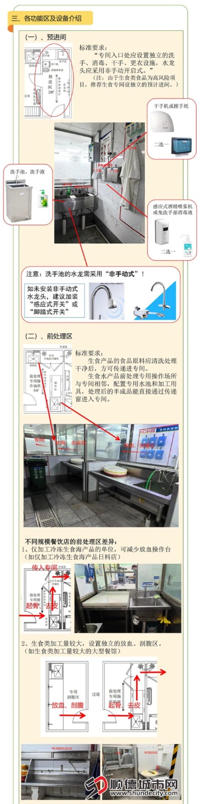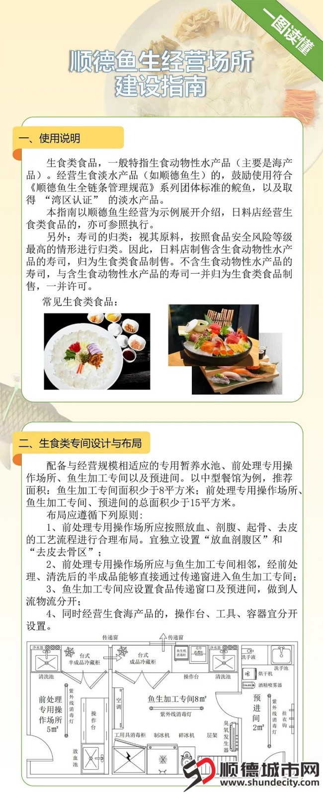 为规范顺德鱼生(生食类食品)制售行为,守护市民舌尖上的安全,顺德区市场监督管理局专门制定《顺德鱼生经营场所建设指南》,以一图读懂的形式,直观地呈现顺德鱼生专间布局、设备设施、卫生要求,让经营者一看就懂、依规建设。