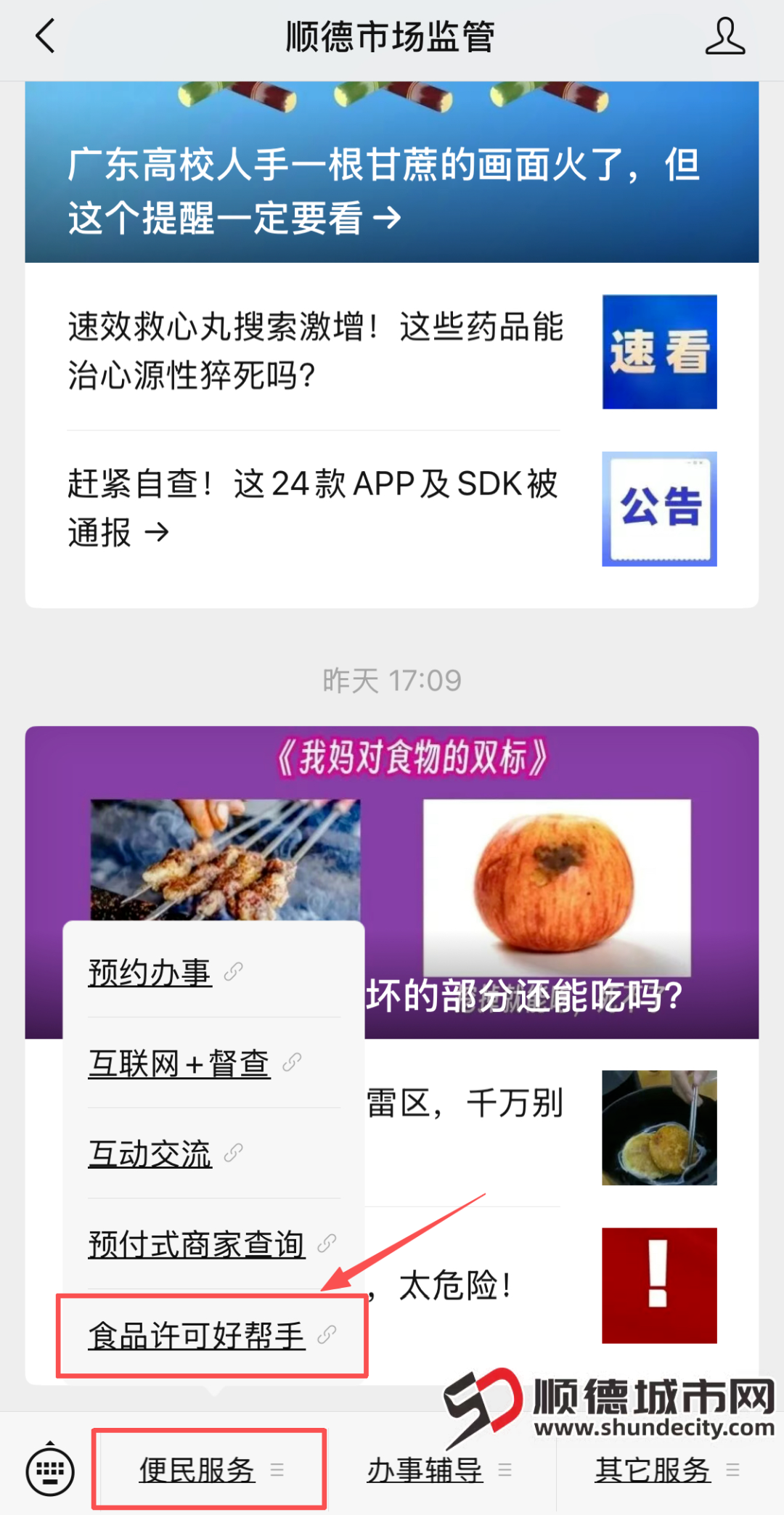 进入“顺德市场监管”官方微信公众号,点击底部菜单栏“便民服务”-“食品许可好帮手”。即可一键查询全品类餐饮建设指南、食品许可办理全流程,一站式解决餐饮经营合规难题!