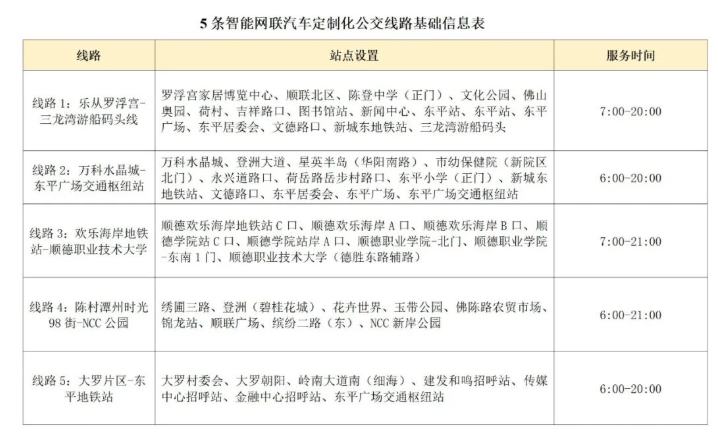 根据《佛山市公交行业智能网联汽车示范应用场景创新试点工作方案》的工作部署,为积极响应顺德区智能网联汽车产业发展部署,进一步提升区域公共交通出行的智能化、便捷化水平,更好满足市民多样化出行需求,现计划在顺德区内试行开通5条智能网联汽车定制化公交线路。现向广大市民征集意见,具体线路信息如下:
