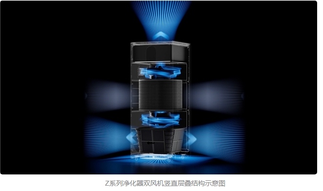 传统单风机方案中,一台风机需独立克服全部系统阻力,往往只有在高转速下才能维持风量,一旦降档,低档位下的有效净化能力便明显衰减。Z120采用双风机竖直层叠设计,将高阻力负担分摊至两台风机,在保障风量的同时,降低单机高转速运行压力;同时,通过多进风口、多出风口以及更大的进风面积,降低入口风阻,提升滤芯不同区域的气流覆盖均匀性。以Z120为例,在最低档位噪声仅33dB的条件下,洁净风量仍可维持在200m³/h,满足长期除醛场景下的低噪运行需求。