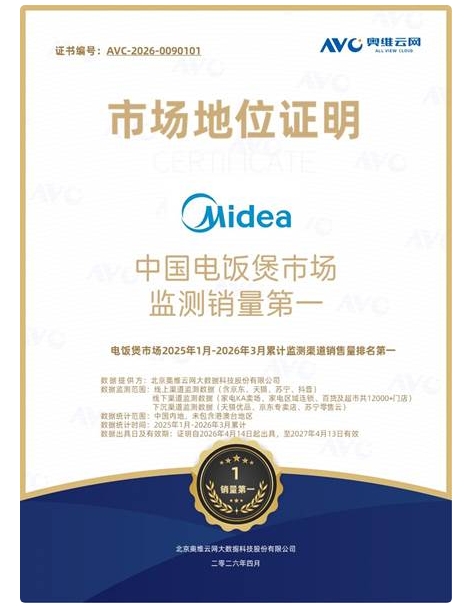 据奥维云网(AVC)监测数据显示,2025年1月至2026年3月累计,美的电饭煲在线上、线下及下沉等全渠道中国电饭煲市场监测销量排名第一。监测期内,美的电饭煲累计销量超1000万台。