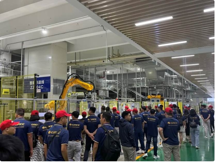 随后,代表团一行先后参观了格力大金自动化生产线、智能仓储物流中心以及高栏港自动化生产线,实地观摩了从精密模具制造、自动化生产装配到智能物流仓储的全流程智能制造体系。在各生产基地,高度自动化的生产线、精准高效的智能装备以及数字化的生产管控体系给代表团留下了深刻印象。代表团近距离见证了格力自主研发的工业机器人与AGV智能物流系统的协同作业,以及5G-A智能工厂、黑灯生产等领先技术的实际应用,对格力严格的质量管控和强大的制造能力表示高度认可,进一步坚定了深耕越南及东南亚市场的信心。