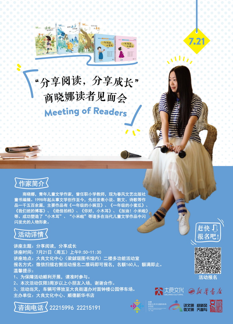 她始终认为灵感源自于生活,生活不断灵感不熄,作品要来源于生活,才会贴近读者,才会真实生动。7月21日,商晓娜将来到梁銶琚图书馆,与你一起分享阅读的快乐,分享成长的点滴!
