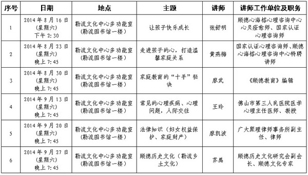 为了丰富广大群众业余文化生活,勒流街道宣传文体办、文化站于8月16日起开展“勒水讲堂”系列免费公益讲座,邀请多位权威专家学者授课,“勒水讲堂”的主题涵盖家庭、教育、历史文化等多方面的内容,欢迎广大群众积极参与。“勒水讲堂”系列公益讲座8月-9月份安排如下: