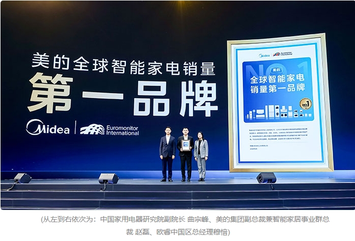欧睿中国区总经理穆愔为美的颁发2025年全球智能家电销量第一证书,中国家电研究院副院长曲宗峰现场见证。
