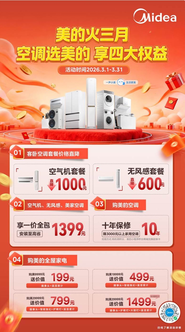 值得一提的是,今年“火三月”活动期间,消费者购买美的空气机、无风感空调,不仅能享受“一价全包”的超值服务,更可叠加多重硬核福利:空气机套餐直降1000元,无风感套餐直降600元;凡购买3000元以上家用空调,还可享10年保修,售后无忧,真正实现从选购、使用到安装、维修的全周期省心体验。