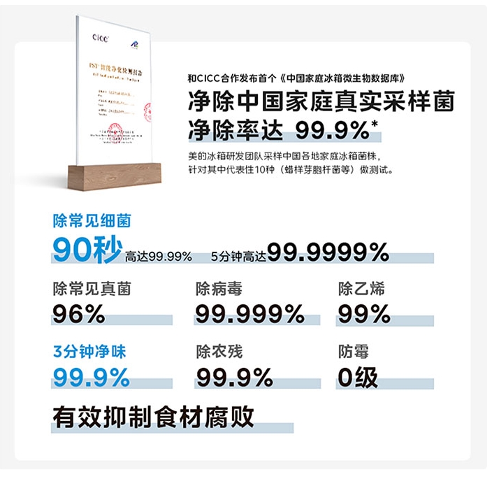 与此同时,PST+智能净化7.0技术,成为行业内唯一实现“冷藏+冷冻”全空间主动除菌的品牌。该技术采用超磁感电场放电系统,可持续输出千万级电解离子,搭配冷藏单原子催化(SAC)技术,实现3分钟急速净味、99.9999%除菌除病毒,九效合一净除200余种有害物质。