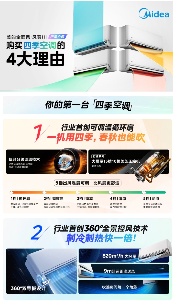 美的全面风·风尊三代的问世,正是以技术创新打破这一困局。凭借360°全景控风和低频分级调温两大行业首创技术,实现压缩机在极低频率下的稳定运行,同时突破传统送风局限,让“四季空调”从概念变为现实,正式引领空调行业迈入“全季候时代”。
